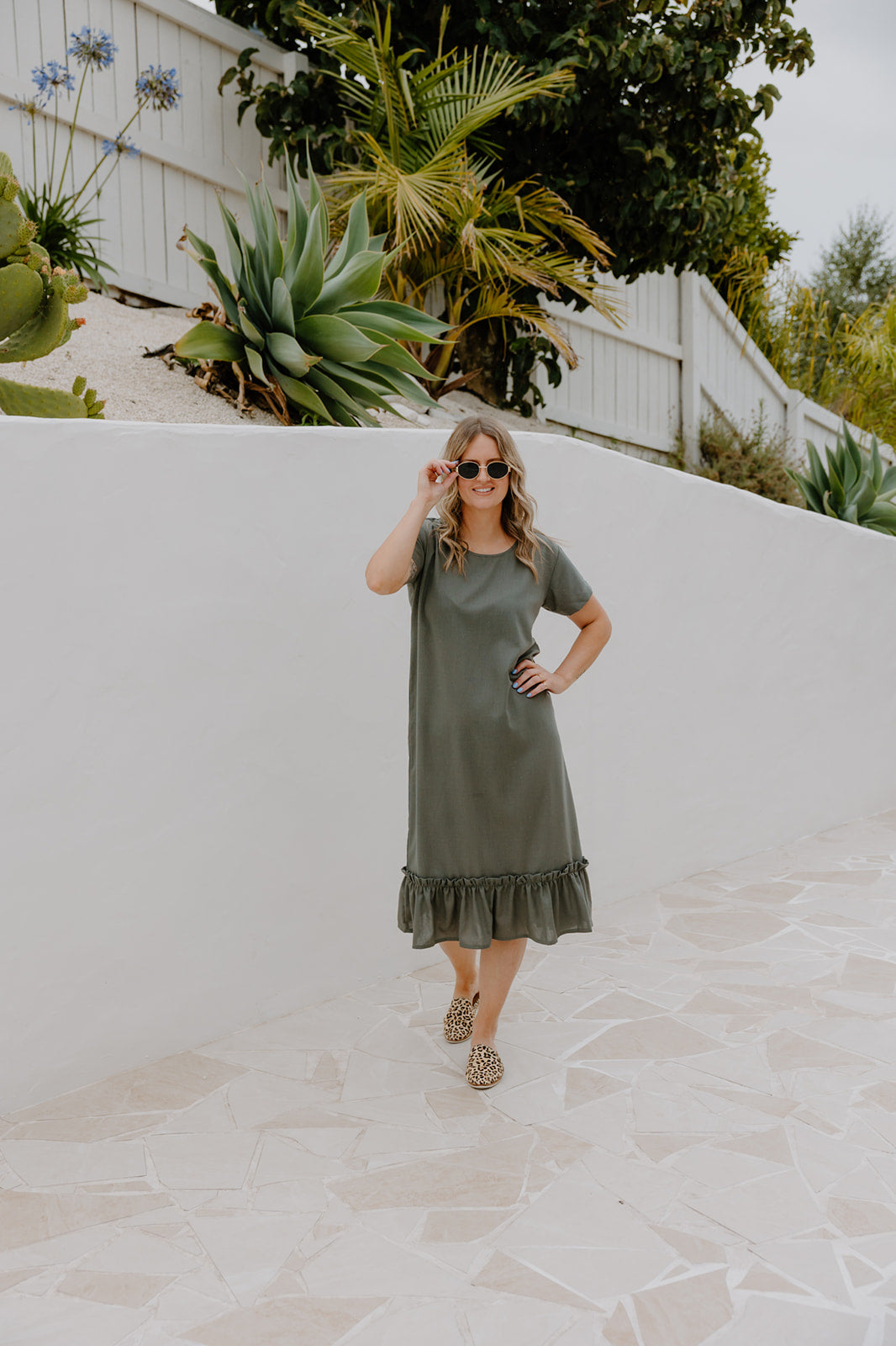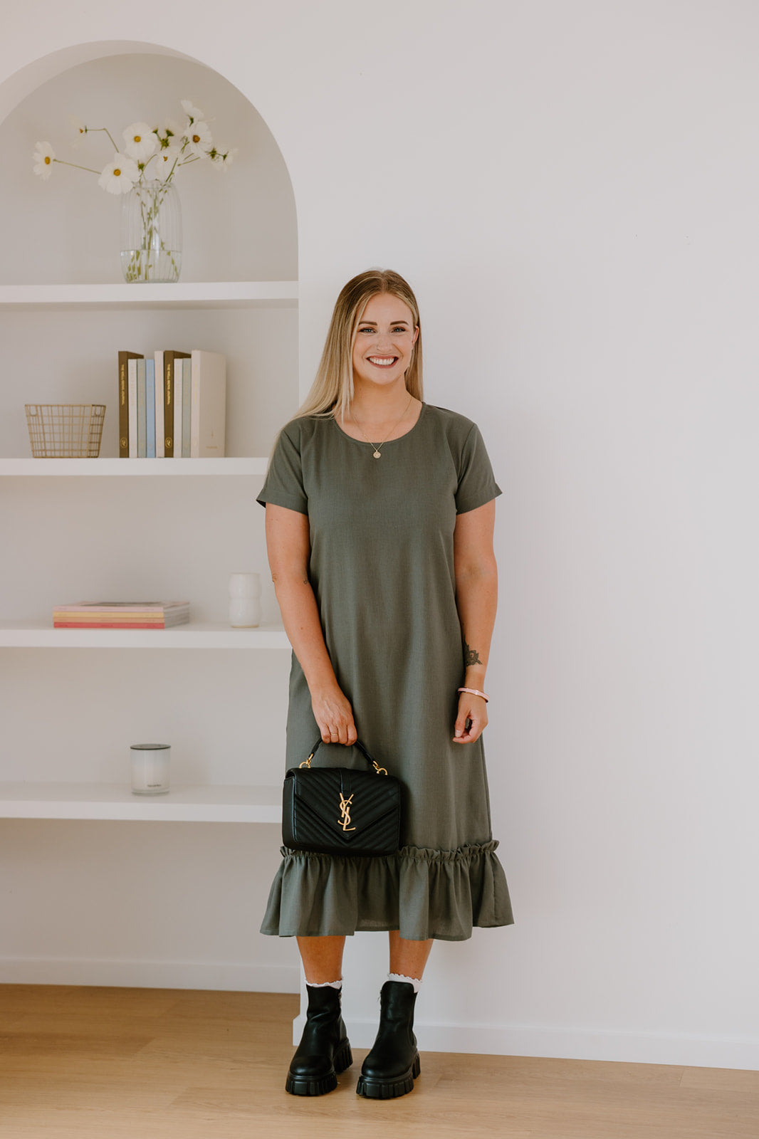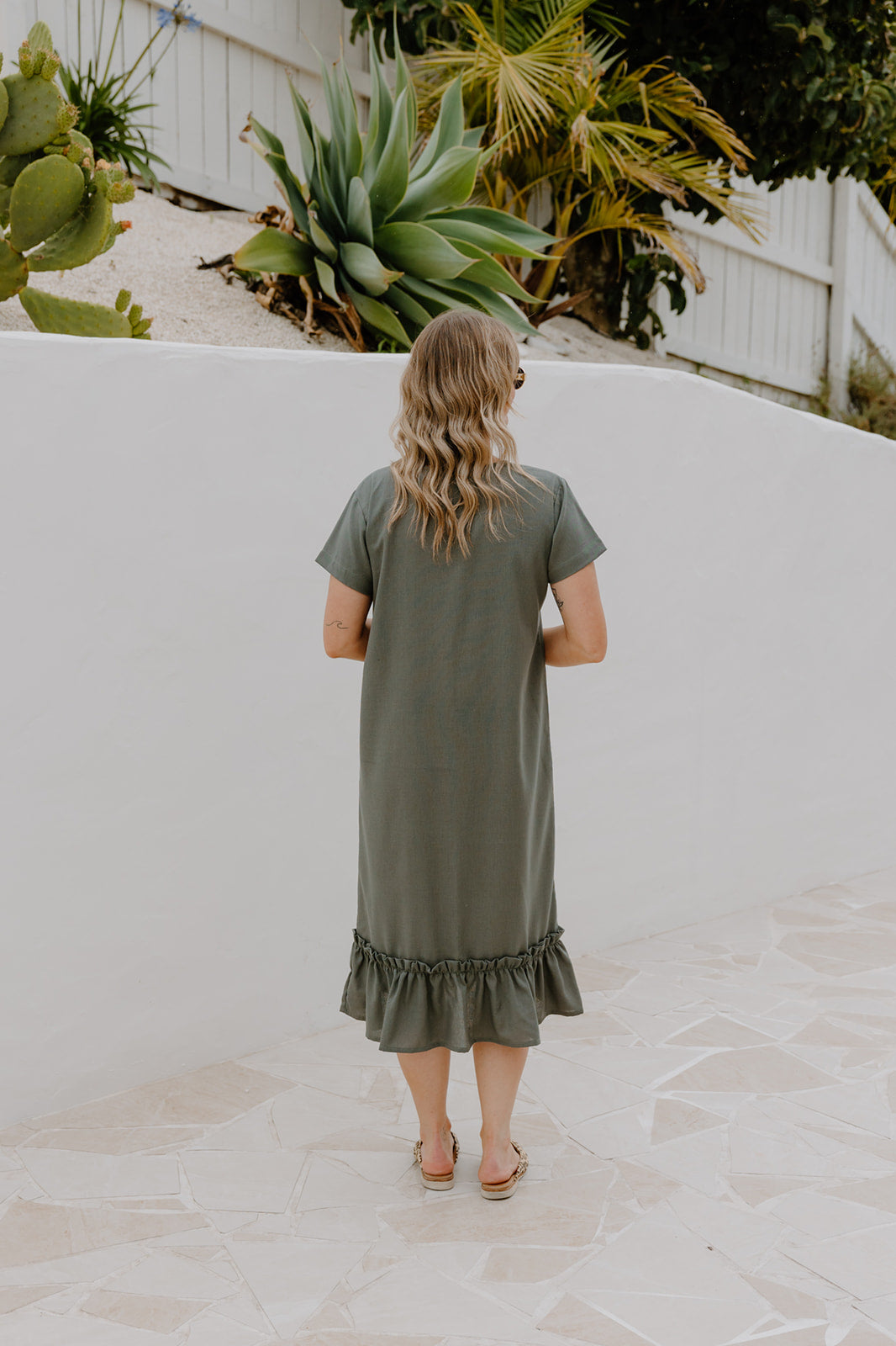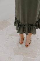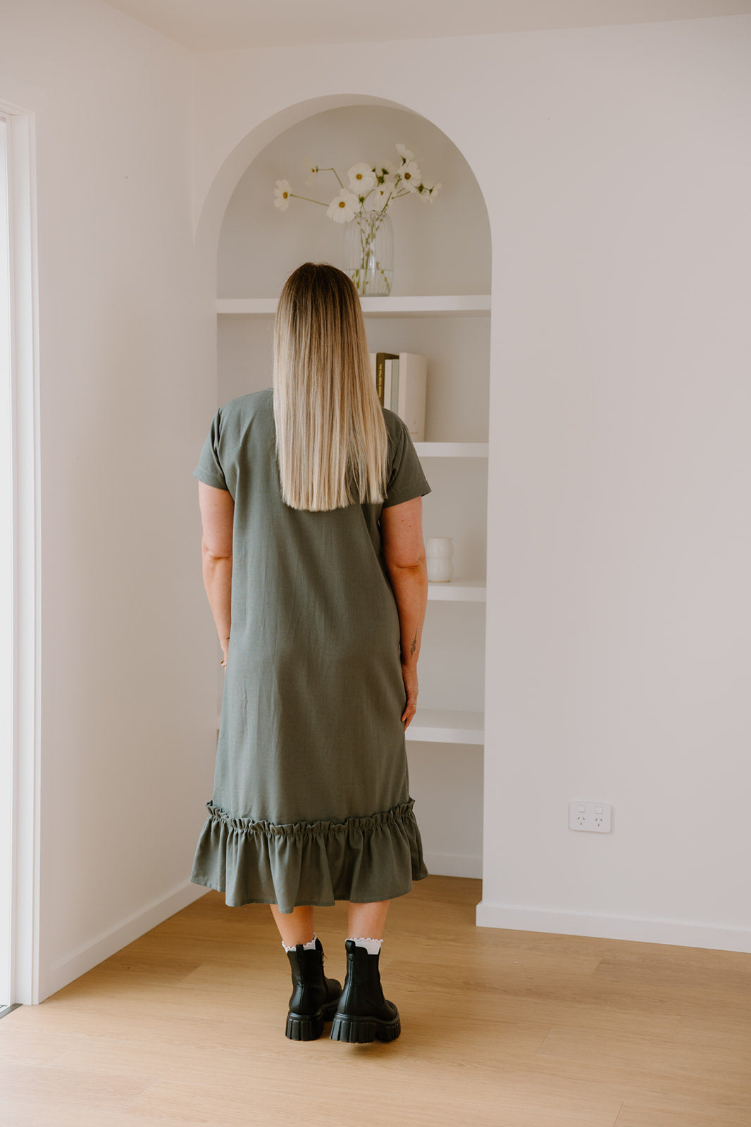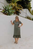 The Courtney Dress is an easy khaki midi you can wear anywhere. Straight through the body with a soft frill hem for a bit of movement. It’s the kind of dress you can throw on for work, wear with sneakers on the weekend, or dress up with jewellery and sandals at night.